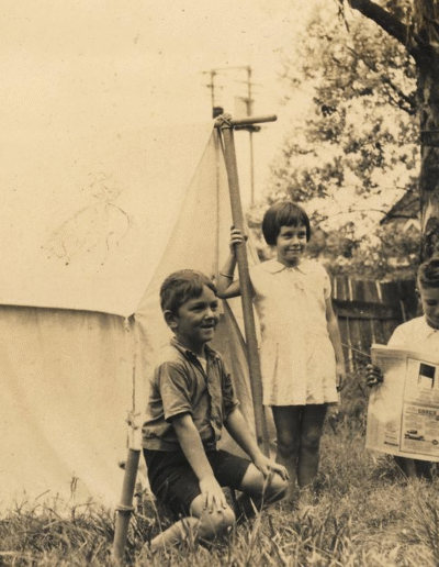 Studio portrait of a father and son during World War 2, (reverse side). Photograph taken by Hilda Mitchell, c1940s and produced as a postcard. Photoria Collection.