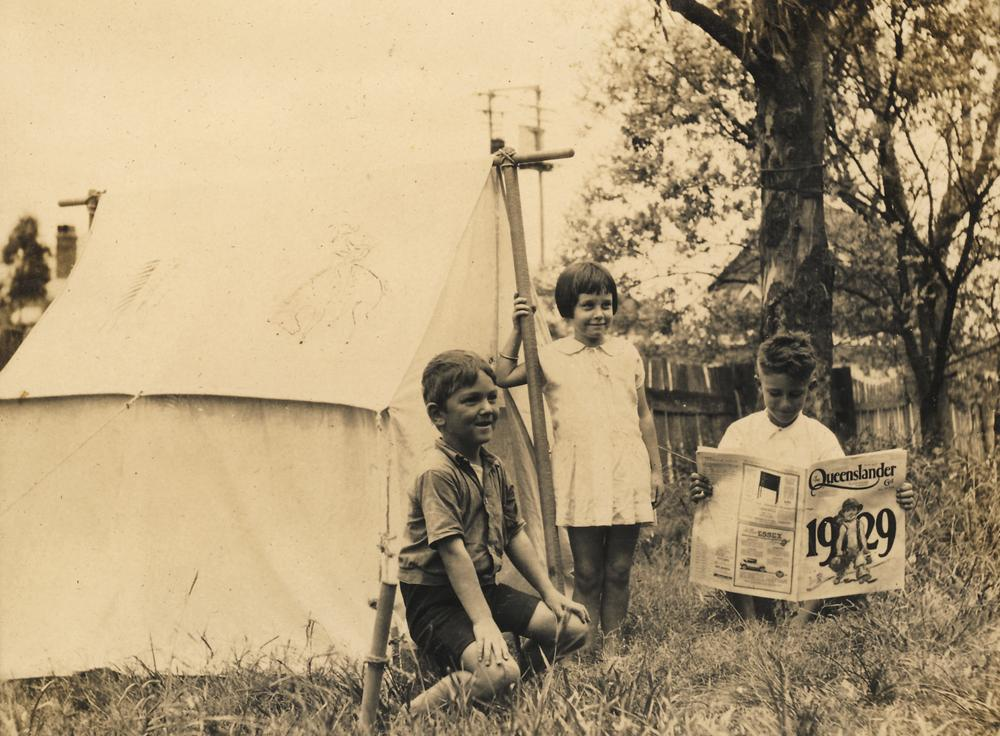 Portrait of bridesmaids in a garden. Taken by Hilda Mitchell, c1930s. Hand coloured photograph mounted on cream card. Photoria Collection