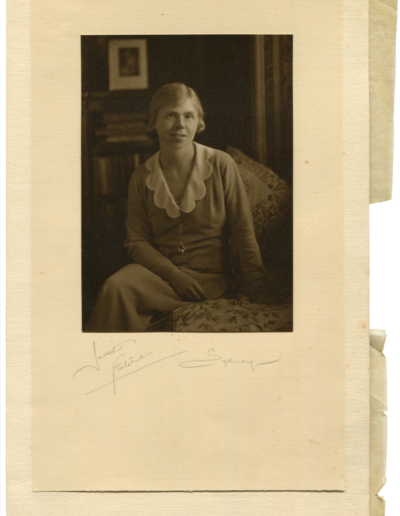 Portrait of young woman standing against a plain background. Sepia photograph, 128mm x 198mm, mounted on light brown card 132mm x 223mm mounted on brown card 200mm x 310mm. Taken by Judith fletcher c1920s. Photoria Collection
