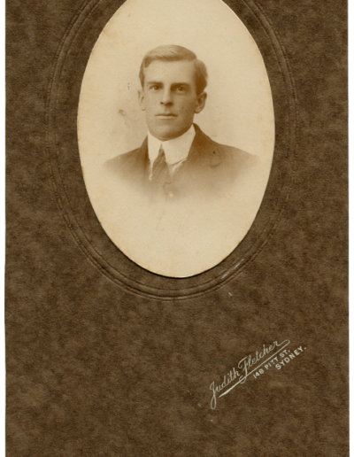 Portrait of a young man framed in an oval, mounted on a mottled brown card. Taken by Judith Fletcher between the years 1910 and 1912. Photoria Collection