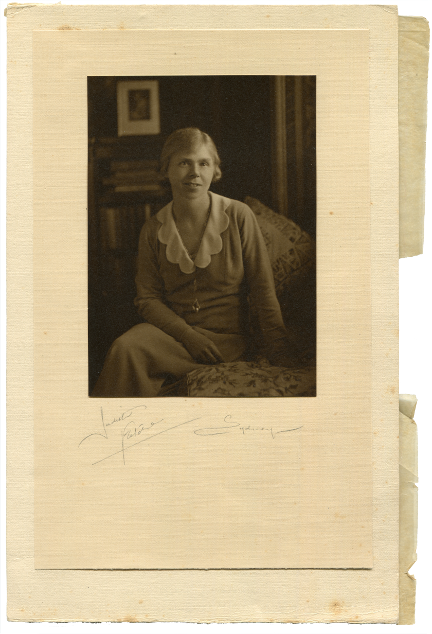 Portrait of young woman standing against a plain background. Sepia photograph, 128mm x 198mm, mounted on light brown card 132mm x 223mm mounted on brown card 200mm x 310mm. Taken by Judith fletcher c1920s. Photoria Collection