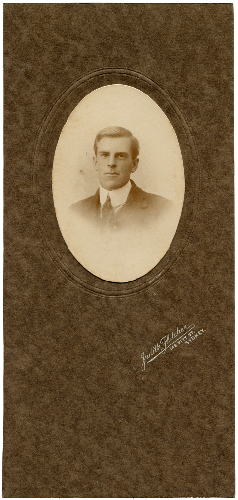 Portrait of a young man framed in an oval, mounted on a mottled brown card. Taken by Judith Fletcher between the years 1910 and 1912. Photoria Collection