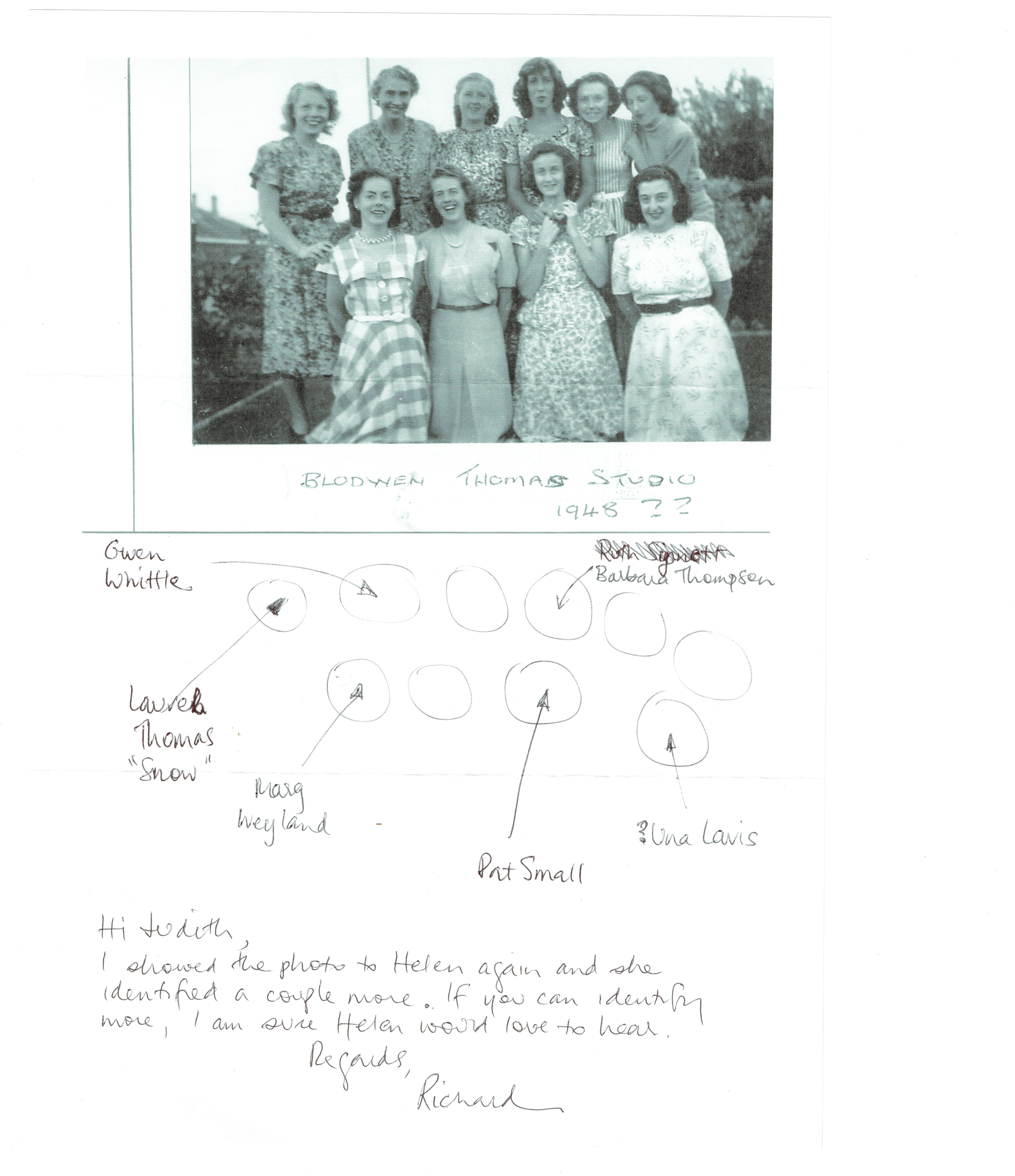 [13] Between 1937 and 1965, some of the staff at the Blodwen Thomas Studio included: Gwen Whittle (Retoucher), Laurel “Snow” Thomas, Dulcie Adelaide Bath (Receptionist), Winifred Joyce Jenner (Retoucher), Helen Godlee (Retoucher), Ruth Synett or Symet, Barb Thompson, Marg Weyland or Weylandt, Dulcie Steer, Ida Hanks, Una Lavis, Barb Bishop, Teddy Hig, Pat Small, Pat Symonds, Rhonda Buckley, Rhon Marchant, Jean Aldenhaven, Jean Taylor, Dulcie Bolk, Marg Pynor, Gwen Arthur, Mrs Hammond, Dorothy Colliver, Barb Wooley, Rosemary Powell, Jean Cockington, Brenda Lock, Bert Ludgate, Helen Ward, Fay Binns, Pat Dean, Barb Bishop, and Pat Whisson.